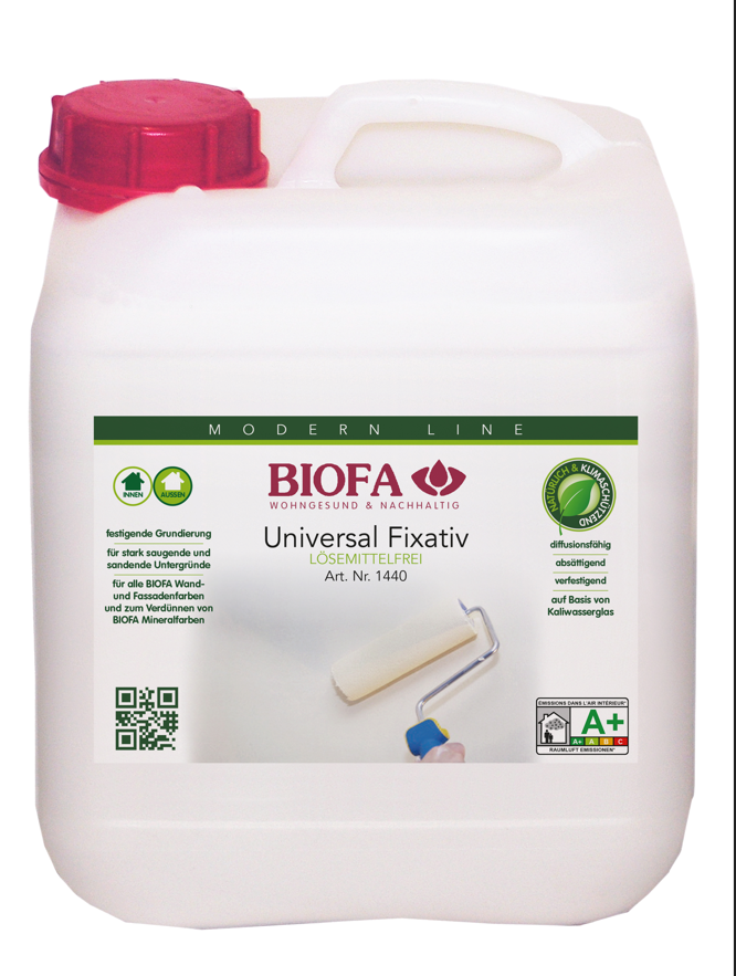 BIOFA Universal Fixativ е грундиращо покритие на основата на калиево водно стъкло, предназначено за попиващи и ронещи се повърхности. Подходящ е като грунд за всички стенни бои BIOFA за вътрешна и външна употреба, както и като разредител за BIOFA SOLIMIN силикатна боя, BIOFA EUROMIN фасадна боя и BIOFA SOLIMIN кварцов мазилен слой.